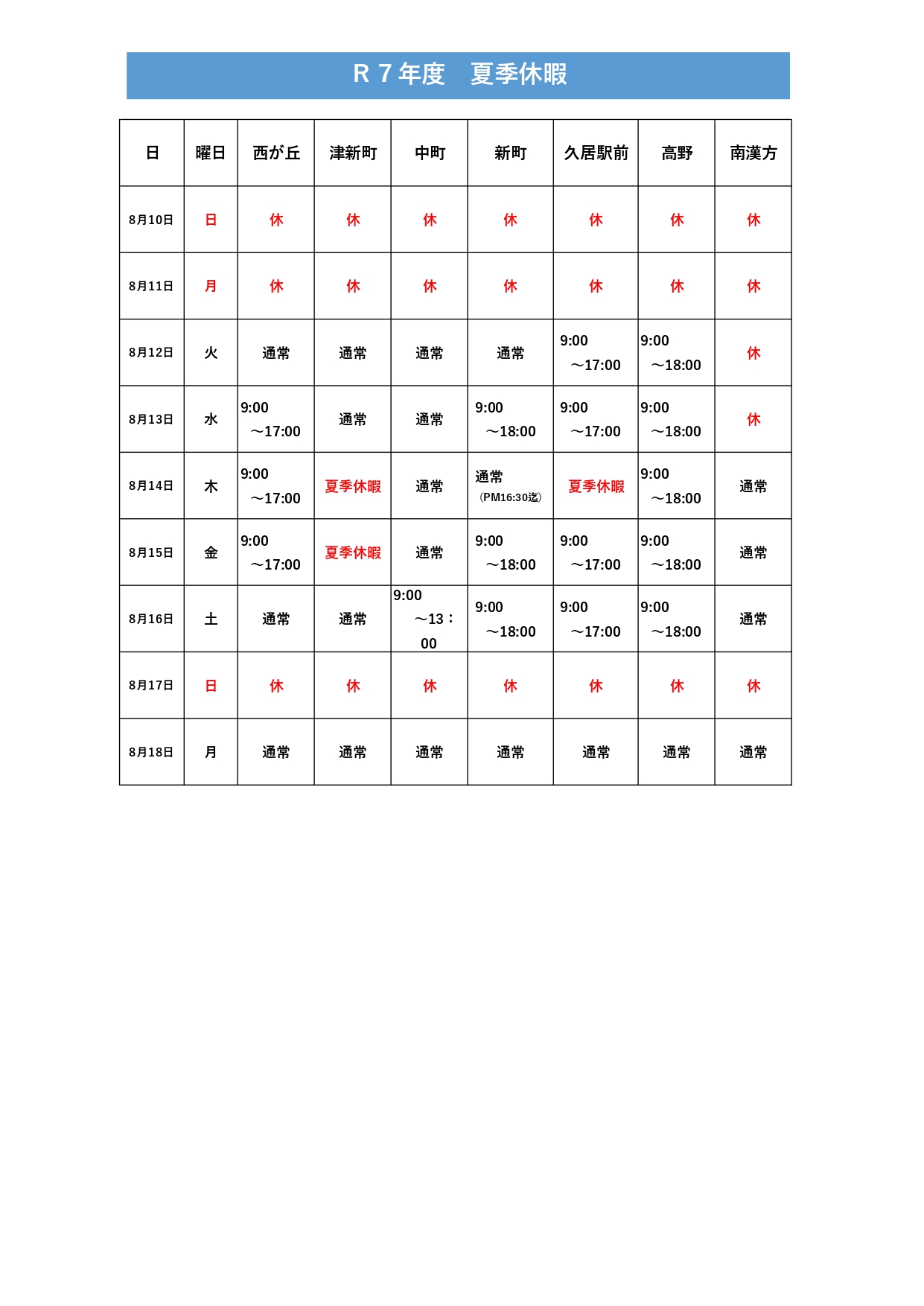 令和7年度 夏季休業のお知らせ